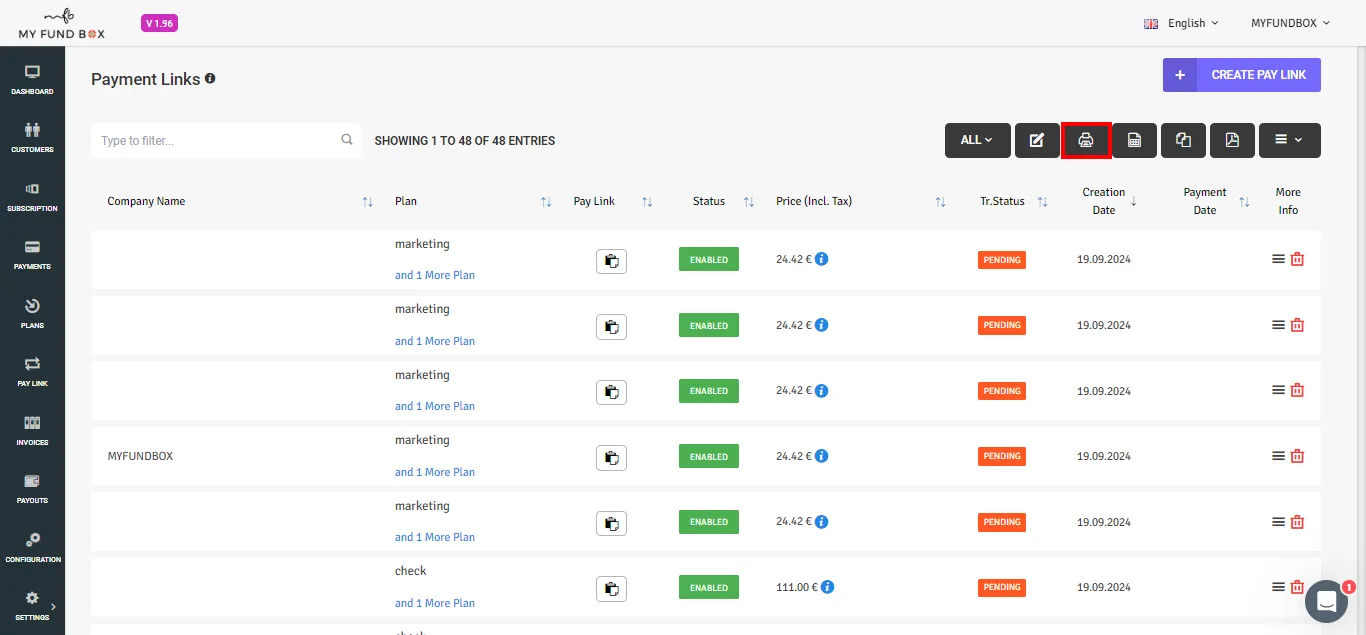 steps to edit (enable/disable) pay links managing the status of pay links is essential, especially when handling pending or canceled transactions hereβs how you can enable or disable pay links based on their transaction status identify the pay link locate the pay link associated with the pending or canceled transaction you want to edit click the edit icon on the top right corner of the screen, you will find the edit icon press this to enter the edit mode toggle the status after entering edit mode, navigate to the specific pay link and find the status button you can change the pay link status here by enabling or disabling it, depending on whether the transaction is pending or canceled note once a pay link transaction has been completed successfully, it cannot be edited youβll only have the option to manage links associated with pending or canceled transactions steps to export the pay link lists to streamline offline verification or maintain a record, you can export pay link lists in various formats hereβs how to export and manage the lists to print the pay link lists if you need a hard copy of your pay link lists for physical verification or documentation press the print icon located on the top right corner of the page this will generate a printable version of the pay link lists to save pay link lists in csv format csv files are helpful for processing data in a structured way to export the lists in this format press the csv icon on the top right corner of the page the pay link lists will automatically download as a csv file, which you can open with spreadsheet software or import into databases to save your pay link lists in excel for users who prefer working in excel press the excel icon on the top right corner the pay link lists will be saved as an excel ( xlsx) file, allowing you to edit and manage them directly within microsoft excel to save your pay links lists as pdf format for a non editable, easily shareable format press the pdf icon located on the top right corner this will save the pay link lists as a pdf file, which you can share or archive for records by following these steps, you can easily manage the status of pay links and export the lists in a format that best suits your needs